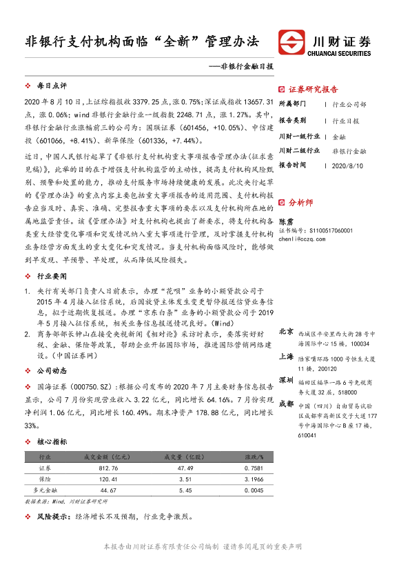 【川财证券】【20200810】非银行金融日报:非银行支付机构面临“全新”管理办法-2页