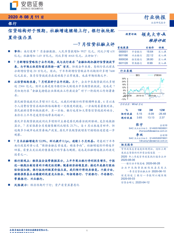 【安信证券】【20200811】7月信贷社融点评:信贷结构好于预期,社融增速继续上行,银行板块配置价值凸显-4页