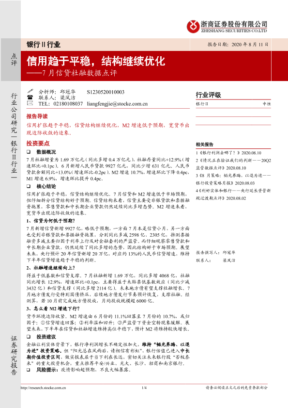 【浙商证券】【20200811】7月信贷社融数据点评:信用趋于平稳,结构继续优化-4页