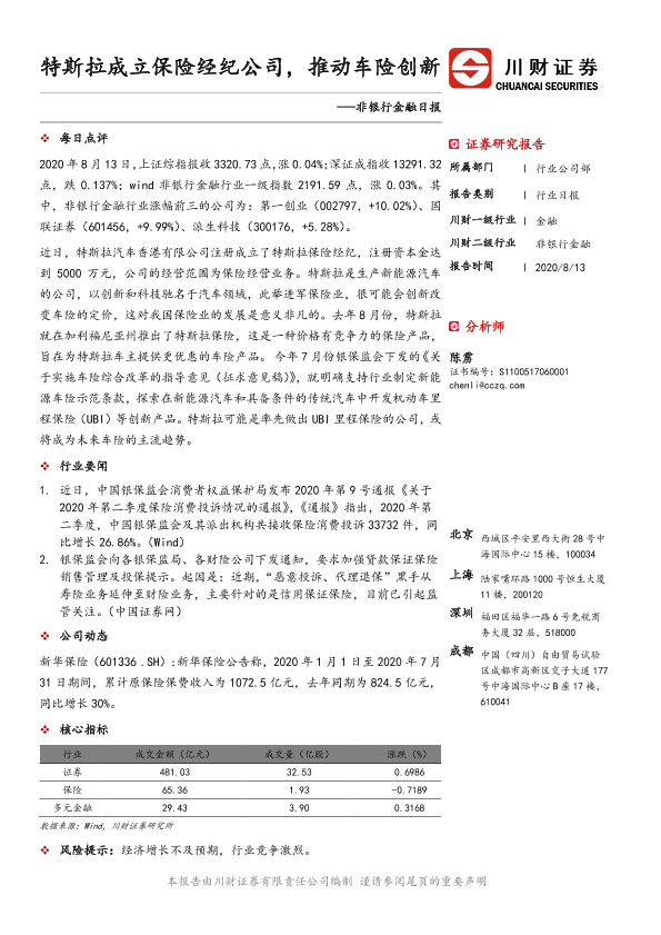 【川财证券】【20200813】非银行金融日报:特斯拉成立保险经纪公司,推动车险创新-2页