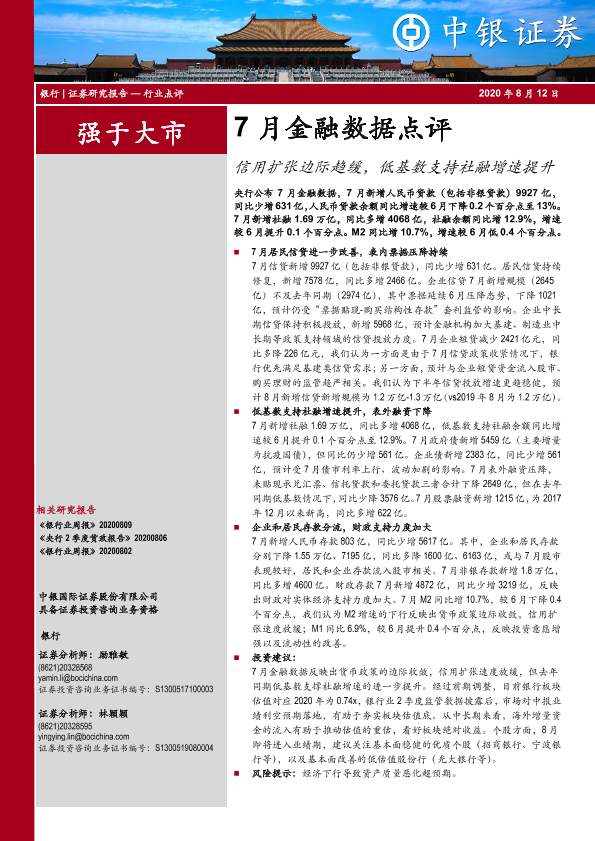 【中银证券】【20200812】7月金融数据点评:信用扩张边际趋缓,低基数支持社融增速提升-6页
