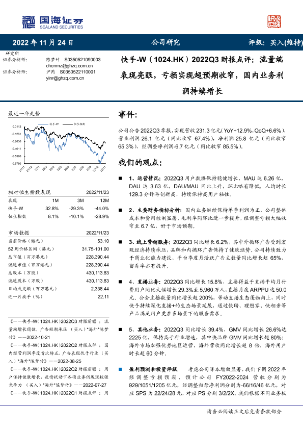 【国海证券】【20221124】快手-W2022Q3财报点评:流量端表现亮眼,亏损实现超预期收窄,国内业务利润持续增长-14页