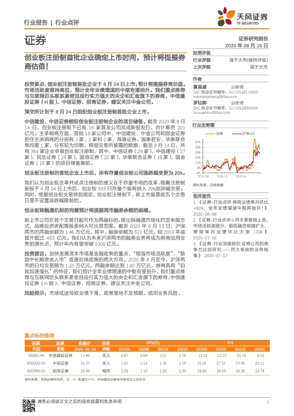 【天风证券】【20200816】证券行业点评:创业板注册制首批企业确定上市时间,预计将提振券商估值!-2页