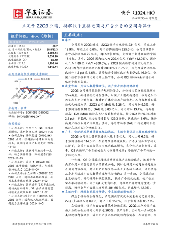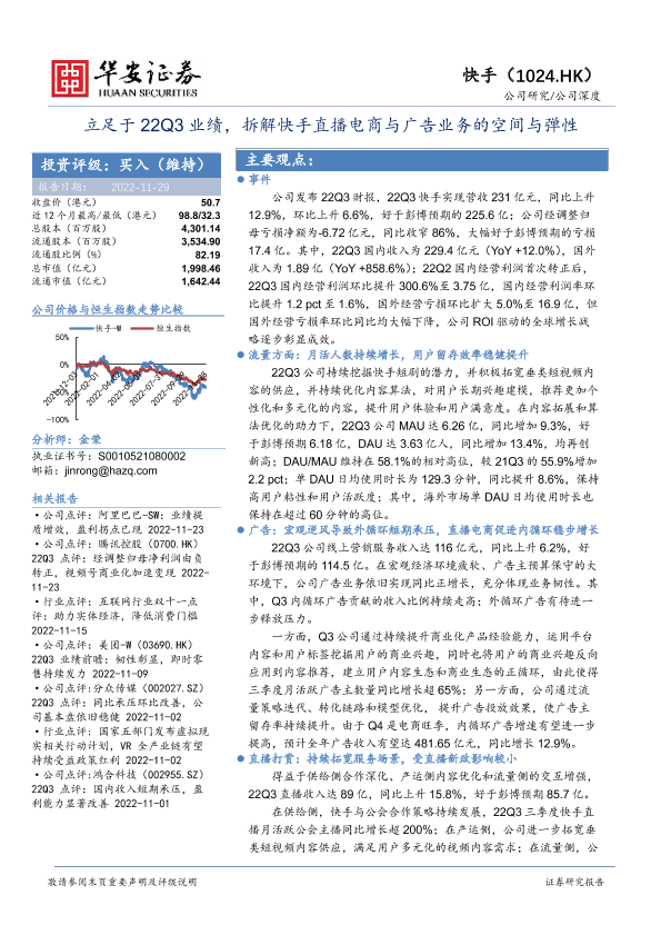 【华安证券】【20221129】快手-W:立足于22Q3业绩,拆解快手直播电商与广告业务的空间与弹性-21页