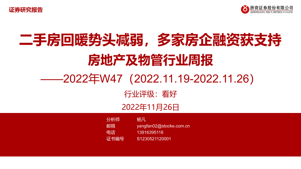 【浙商证券】【20221126】房地产及物管行业周报2022年W47:二手房回暖势头减弱,多家房企融资获支持-34页