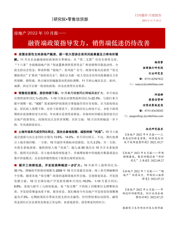 【招商银行】【20221202】房地产2022年10月报——融资端政策指导发力,销售端低迷仍待改善-20页