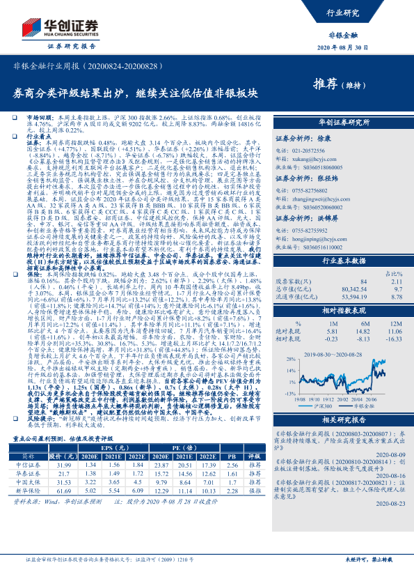 【华创证券】【20200830】非银金融行业周报:券商分类评级结果出炉,继续关注低估值非银板块-19页