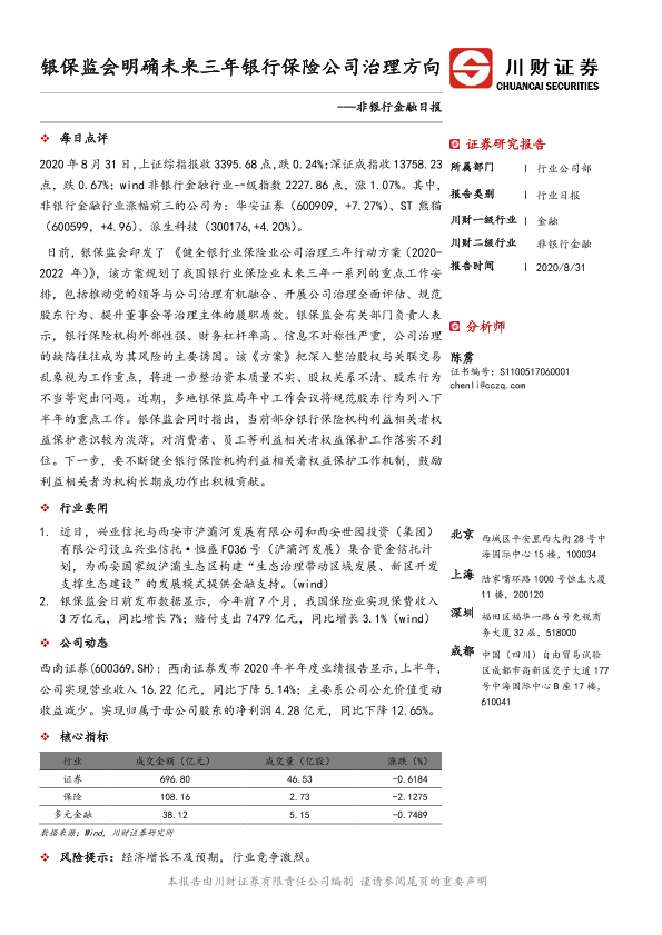 【川财证券】【20200831】非银行金融日报:银保监会明确未来三年银行保险公司治理方向-2页