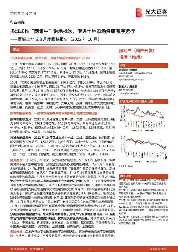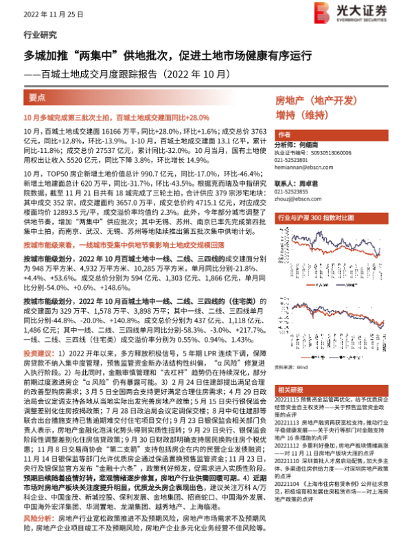 【光大证券】【20221125】房地产行业百城土地成交月度跟踪报告(2022年10月):多城加推“两集中”供地批次,促进土地市场健康有序运行-18页