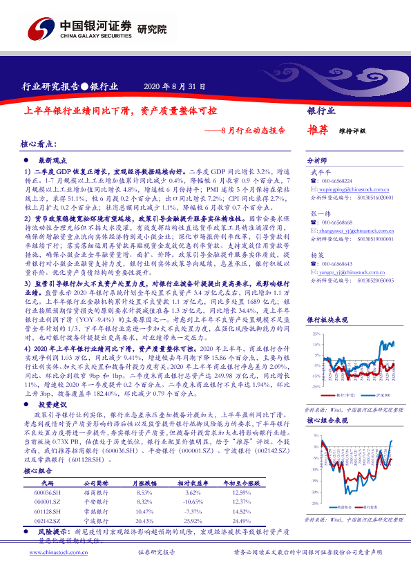 【银河证券】【20200831】银行业8月行业动态报告:上半年银行业绩同比下滑,资产质量整体可控-26页