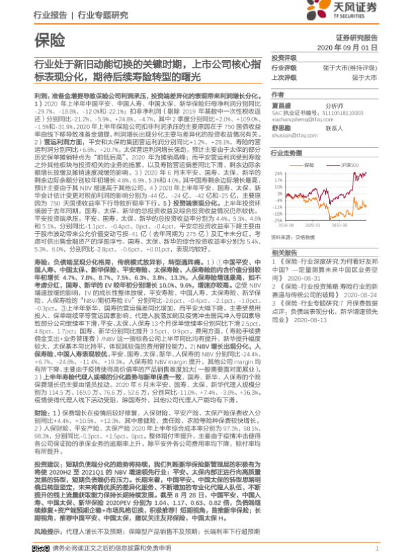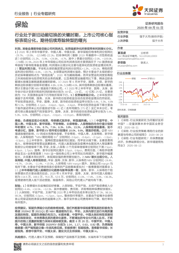 【天风证券】【20200901】保险行业专题研究:行业处于新旧动能切换的关键时期,上市公司核心指标表现分化,期待后续寿险转型的曙光-20页