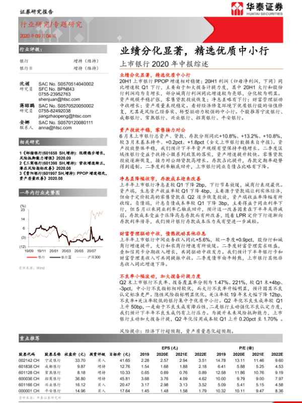 【华泰证券】【20200904】上市银行2020年中报综述:业绩分化显著,精选优质中小行-20页