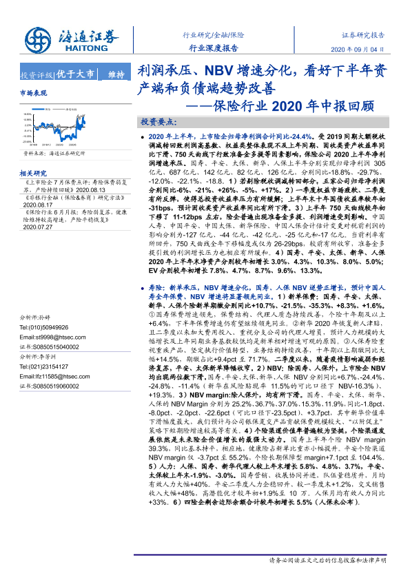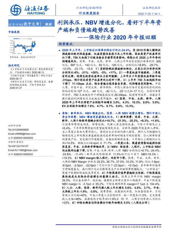 【海通证券】【20200904】保险行业2020年中报回顾:利润承压、NBV增速分化,看好下半年资产端和负债端趋势改善-27页
