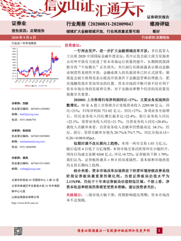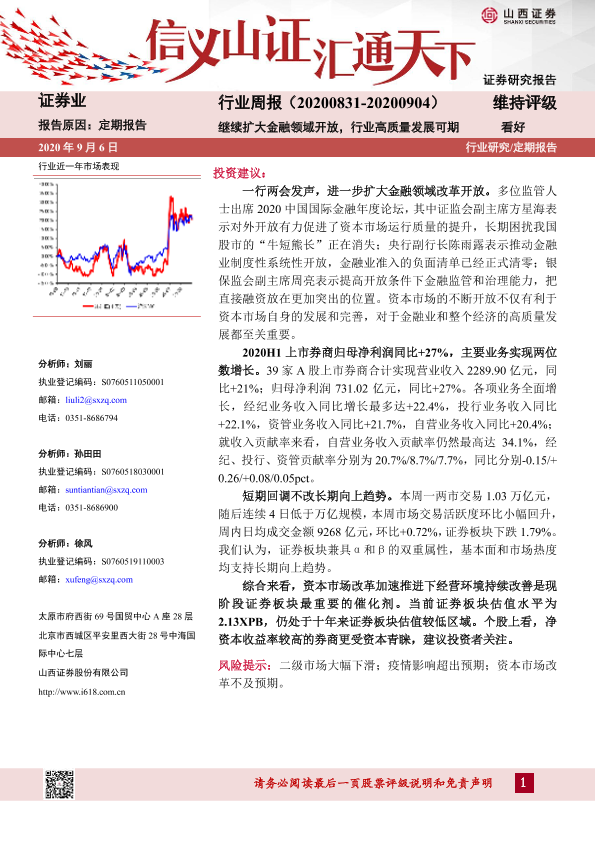 【山西证券】【20200906】证券业行业周报:继续扩大金融领域开放,行业高质量发展可期-13页