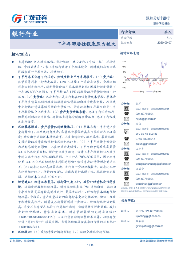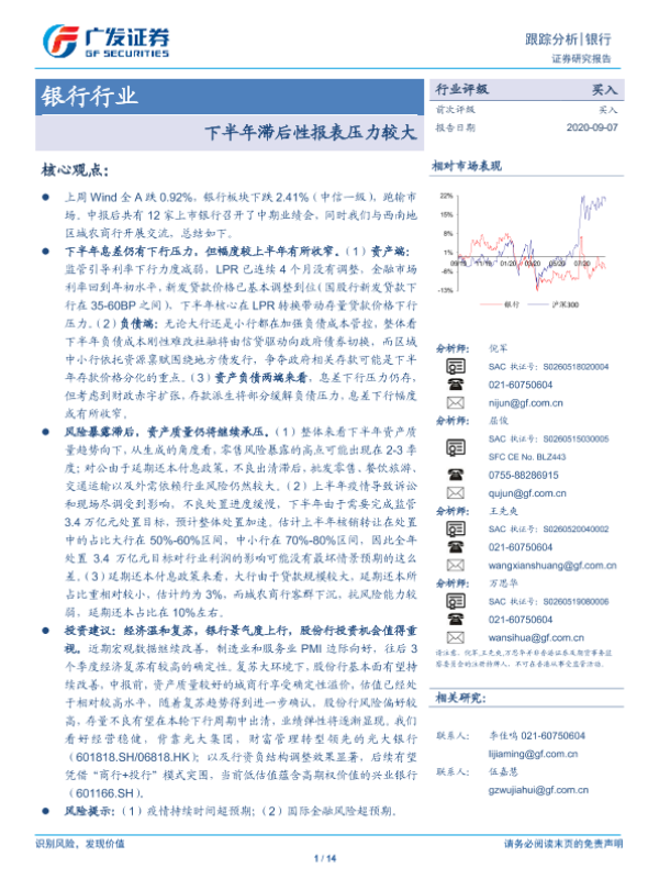 【广发证券】【20200907】银行行业跟踪分析:下半年滞后性报表压力较大-14页