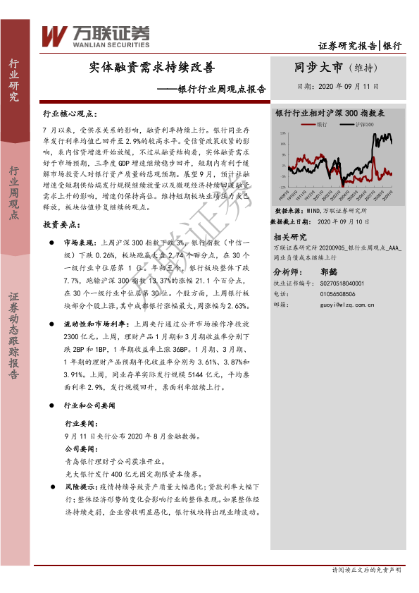 【万联证券】【20200911】银行行业周观点报告:实体融资需求持续改善-7页
