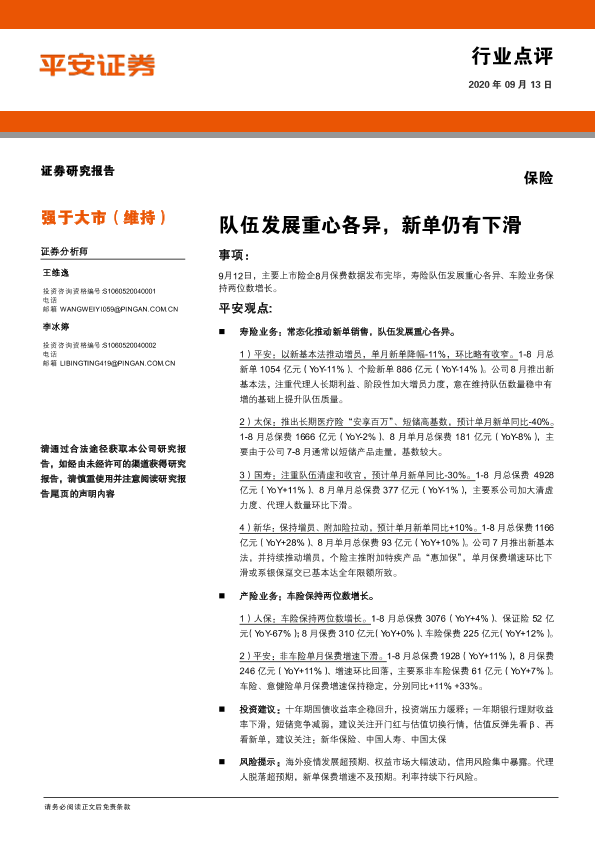 【平安证券】【20200913】保险行业点评:队伍发展重心各异,新单仍有下滑-4页
