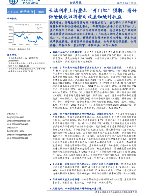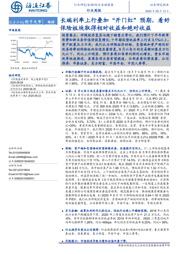 【海通证券】【20200913】综合金融服务行业周报:长端利率上行叠加“开门红”预期,看好保险板块取得相对收益和绝对收益-9页