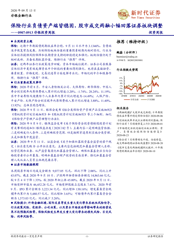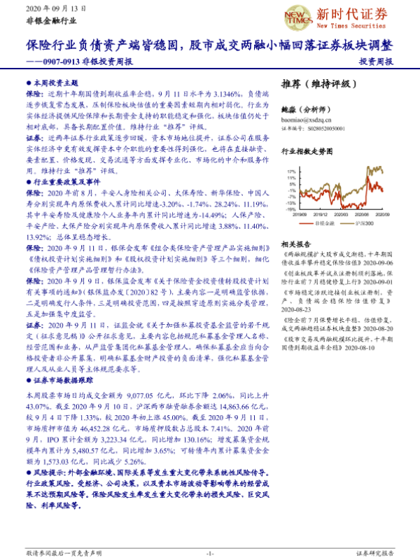【新时代证券】【20200913】非银投资周报:保险行业负债资产端皆稳固,股市成交两融小幅回落证券板块调整-13页
