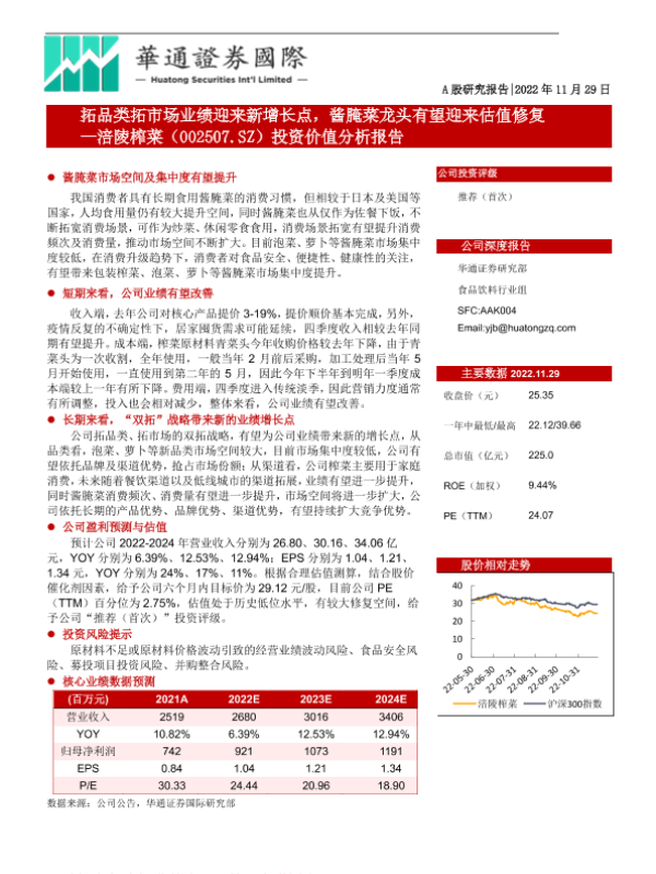 【华通证券国际】【20221129】投资价值分析报告:拓品类拓市场业绩迎来新增长点,酱腌菜龙头有望迎来估值修复-29页