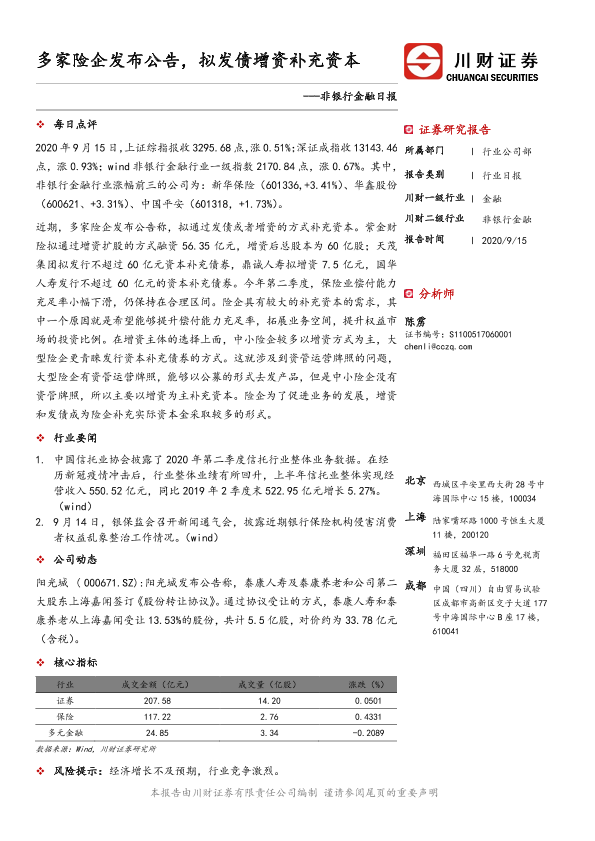 【川财证券】【20200915】非银行金融日报:多家险企发布公告,拟发债增资补充资本-2页