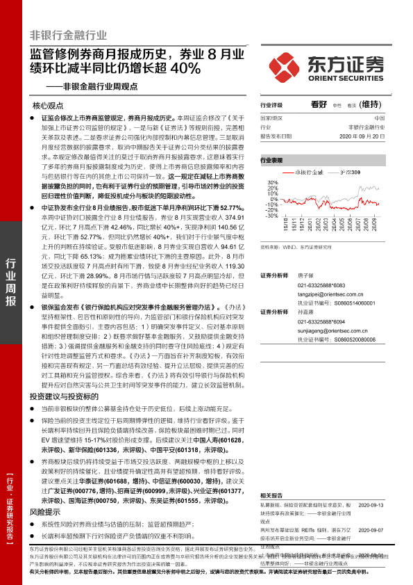 【东方证券】【20200920】非银金融行业周观点:监管修例券商月报成历史,券业8月业绩环比减半同比仍增长超40%-11页
