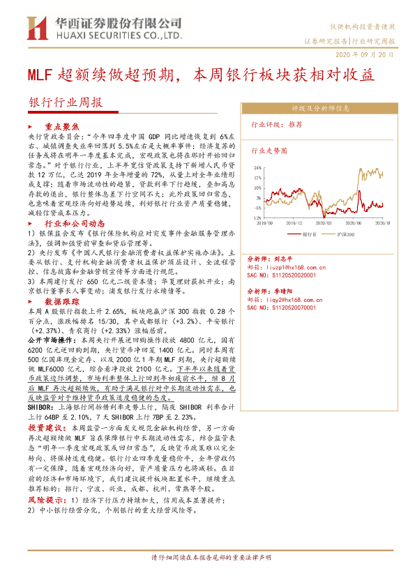 【华西证券】【20200920】银行行业周报:MLF超额续做超预期,本周银行板块获相对收益-6页