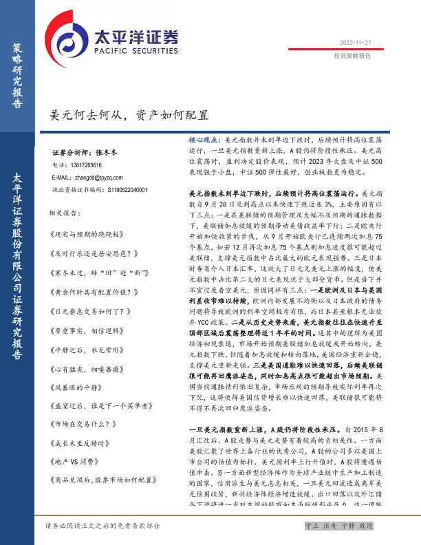 【太平洋证券】【20221127】投资策略报告:美元何去何从,资产如何配置-16页