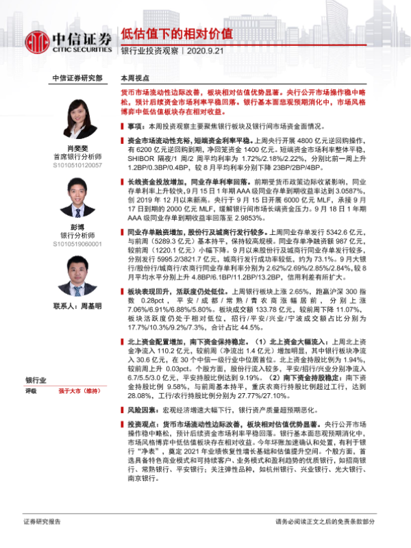【中信证券】【20200921】银行业投资观察:低估值下的相对价值-9页