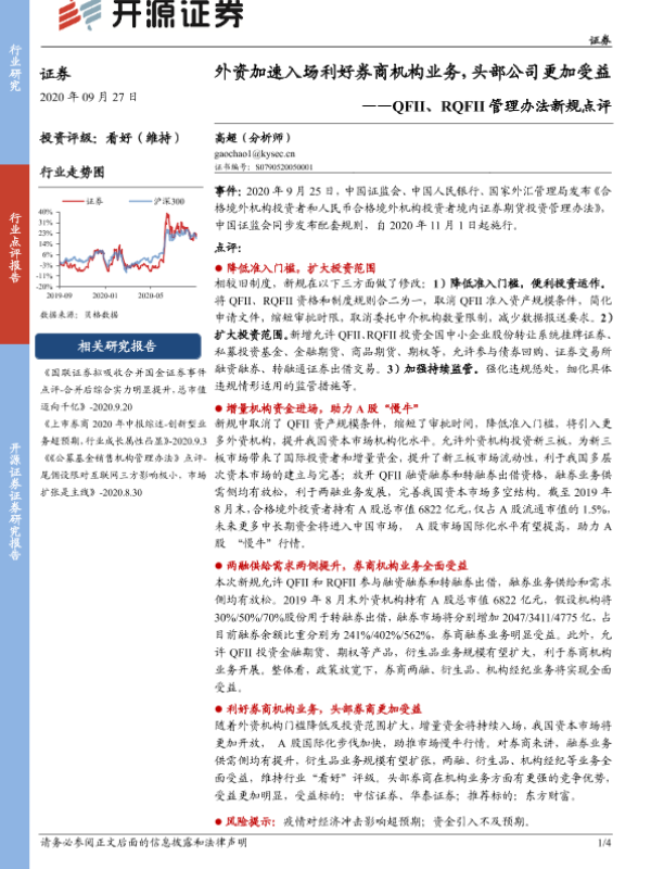 【开源证券】【20200927】QFII、RQFII管理办法新规点评:外资加速入场利好券商机构业务,头部公司更加受益-4页