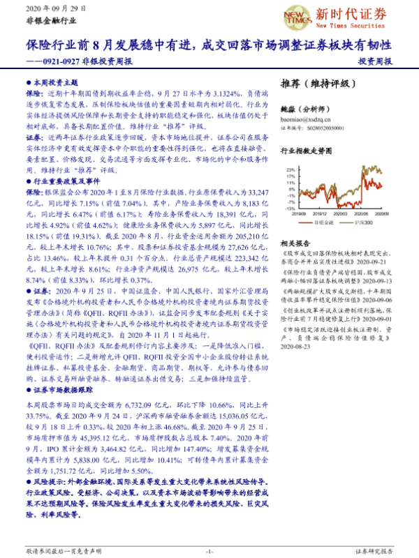 【新时代证券】【20200929】新时代证券-非银投资周报:保险行业前8月发展稳中有进,成交回落市场调整证券板块有韧性-13页
