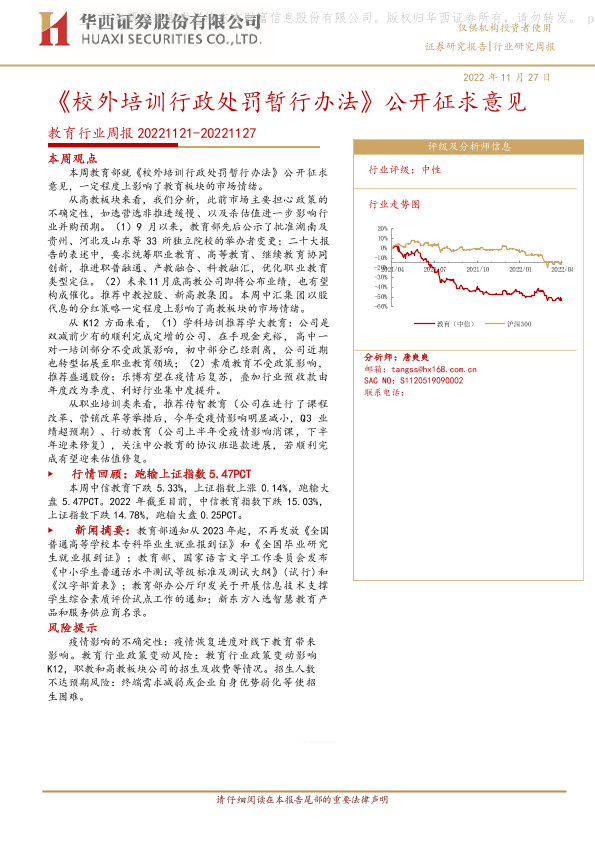 【华西证券】【20221127】教育行业周报:《校外培训行政处罚暂行办法》公开征求意见-14页
