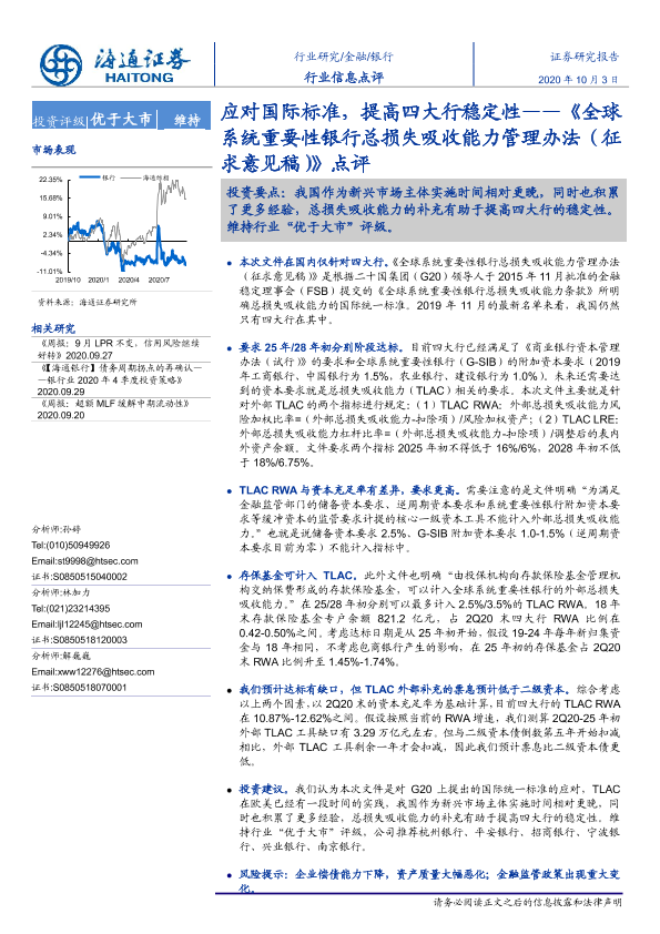 【海通证券】【20201003】应对国际标准,提高四大行稳定性——《全球系统重要性银行总损失吸收能力管理办法(征求意见稿)》点评-5页