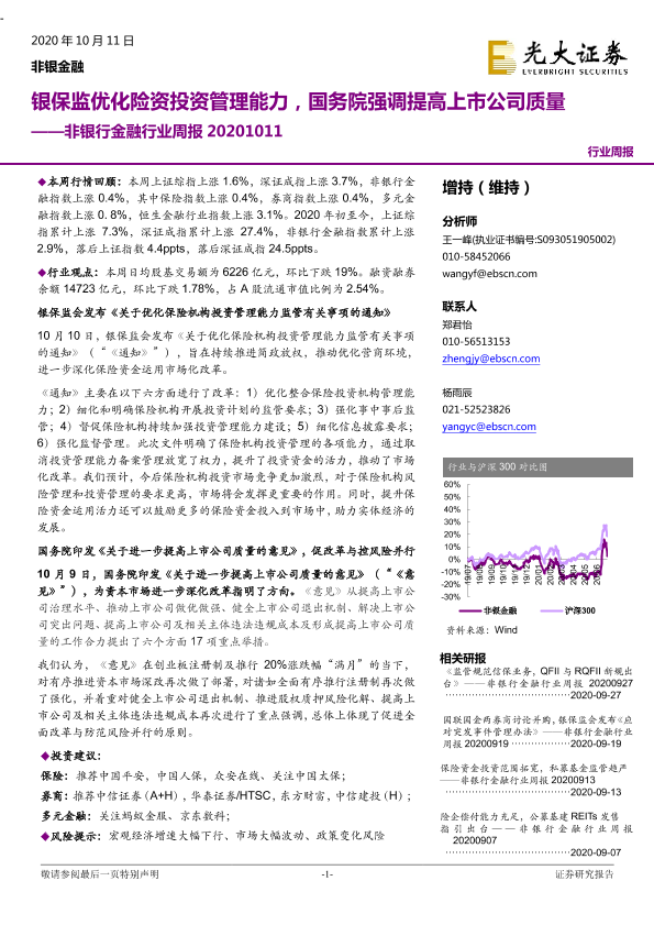 【光大证券】【20201011】非银行金融行业周报:银保监优化险资投资管理能力,国务院强调提高上市公司质量-14页