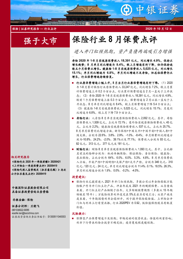 【中银证券】【20201012】保险行业8月保费点评:进入开门红预热期,资产负债两端吸引力增强-8页