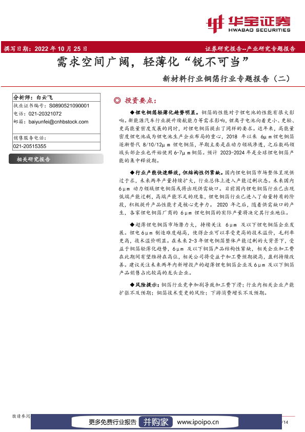 【华宝证券】【20221025】新材料行业铜箔行业专题报告(二):需求空间广阔,轻薄化“锐不可当”-14页