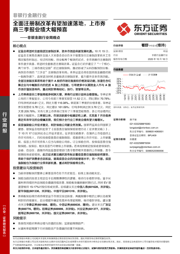 【东方证券】【20201018】非银行金融行业周观点:全面注册制改革有望加速落地,上市券商三季报业绩大幅预喜-11页