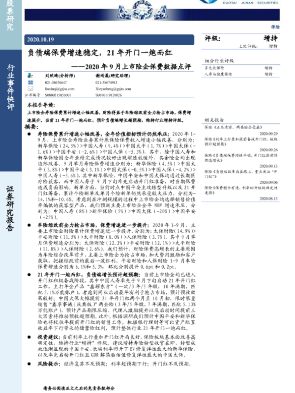 【国泰君安证券】【20201019】2020年9月上市险企保费数据点评:负债端保费增速稳定,21年开门一炮而红-5页
