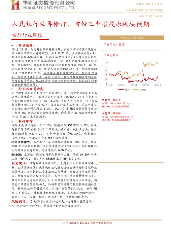 【华西证券】【20201025】银行行业周报:人民银行法再修订,首份三季报提振板块预期-8页