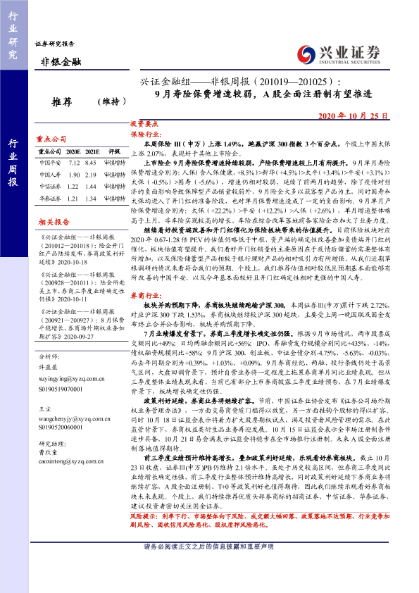 【兴业证券】【20201025】非银周报:9月寿险保费增速较弱,A股全面注册制有望推进-11页