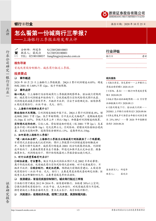 【浙商证券】【20201025】上海银行三季报业绩发布点评:怎么看第一份城商行三季报?-3页