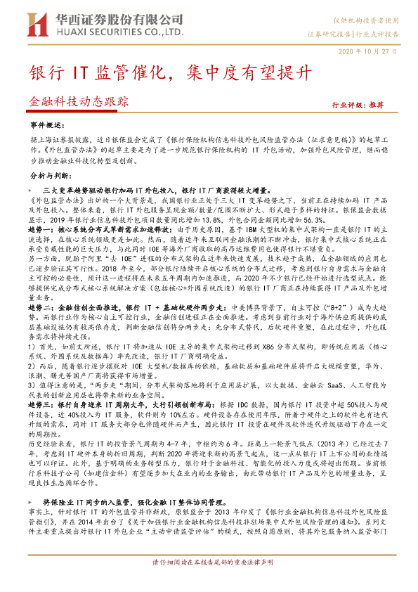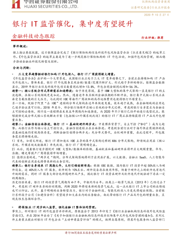 【华西证券】【20201027】金融科技动态跟踪:银行IT监管催化,集中度有望提升-6页