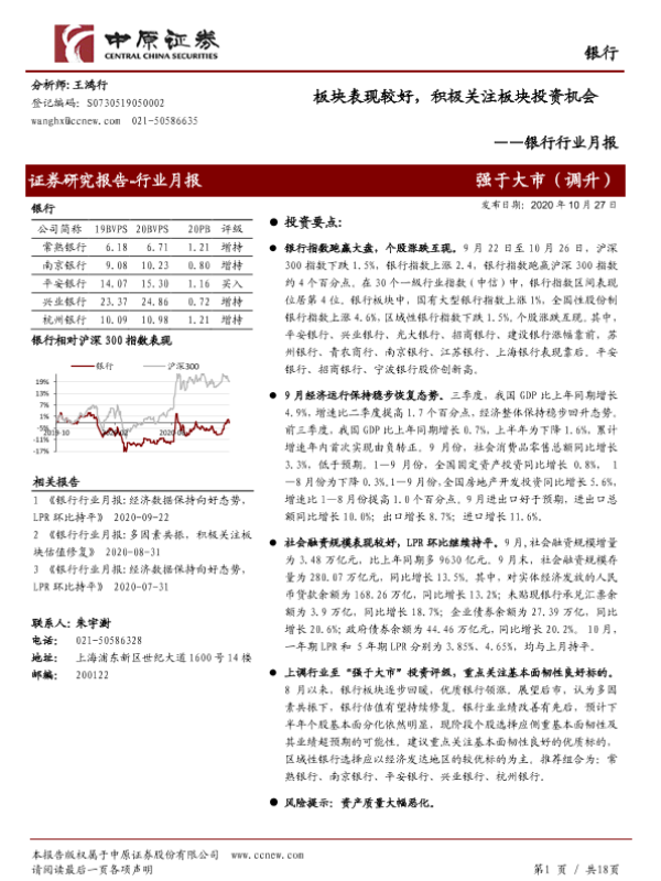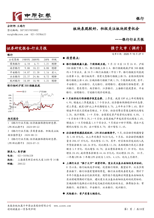 【中原证券】【20201027】银行行业月报:板块表现较好,积极关注板块投资机会-18页
