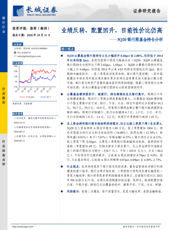 【长城证券】【20201031】3Q20银行股基金持仓分析:业绩反转、配置回升,目前性价比仍高-4页
