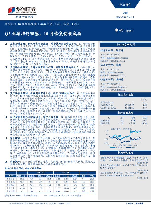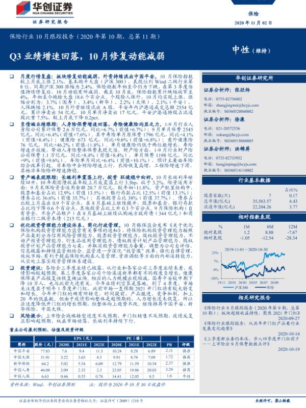 【华创证券】【20201102】保险行业10月跟踪报告:Q3业绩增速回落,10月修复动能减弱-25页