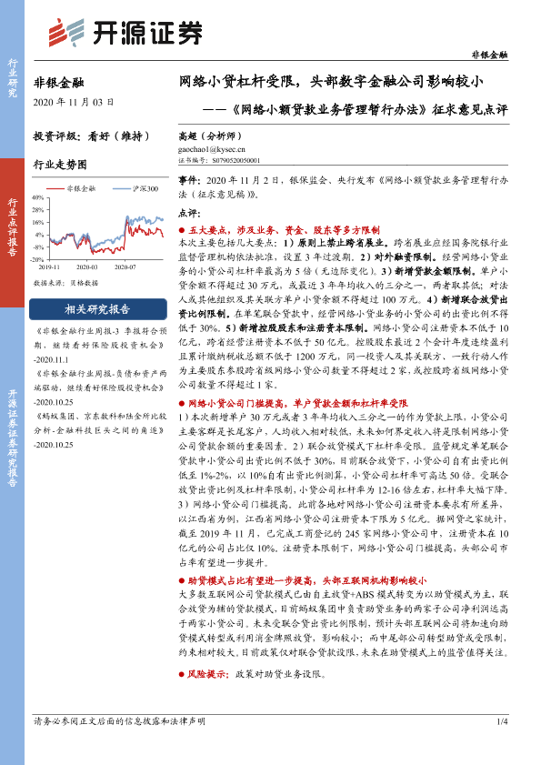 【开源证券】【20201103】网络小额贷款业务管理暂行办法征求意见点评:网络小贷杠杆受限,头部数字金融公司影响较小-4页