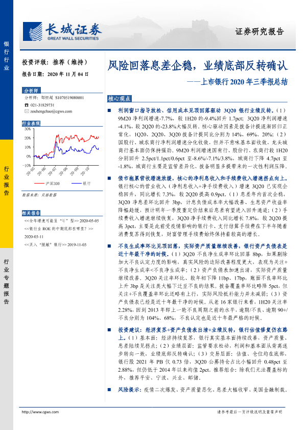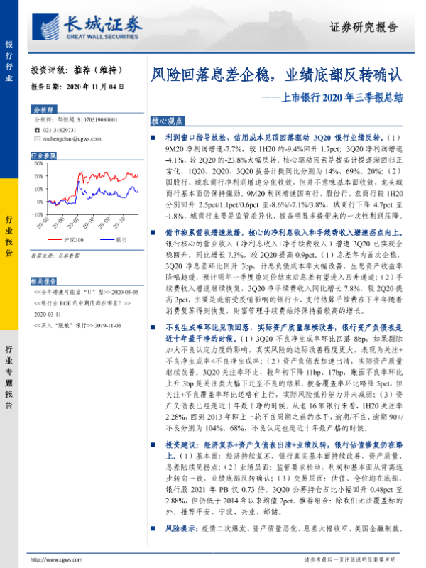 【长城证券】【20201104】上市银行2020年三季报总结:风险回落息差企稳,业绩底部反转确认-9页