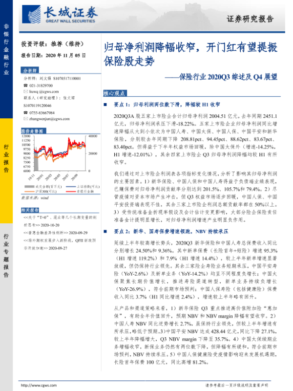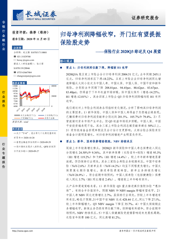 【长城证券】【20201105】保险行业2020Q3综述及Q4展望:归母净利润降幅收窄,开门红有望提振保险股走势-19页