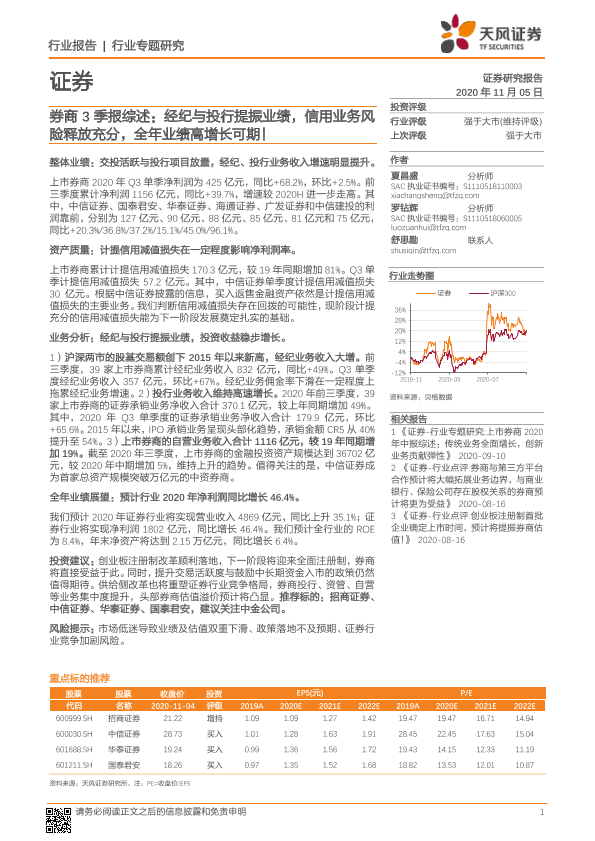 【天风证券】【20201105】券商3季报综述:经纪与投行提振业绩,信用业务风险释放充分,全年业绩高增长可期!-16页
