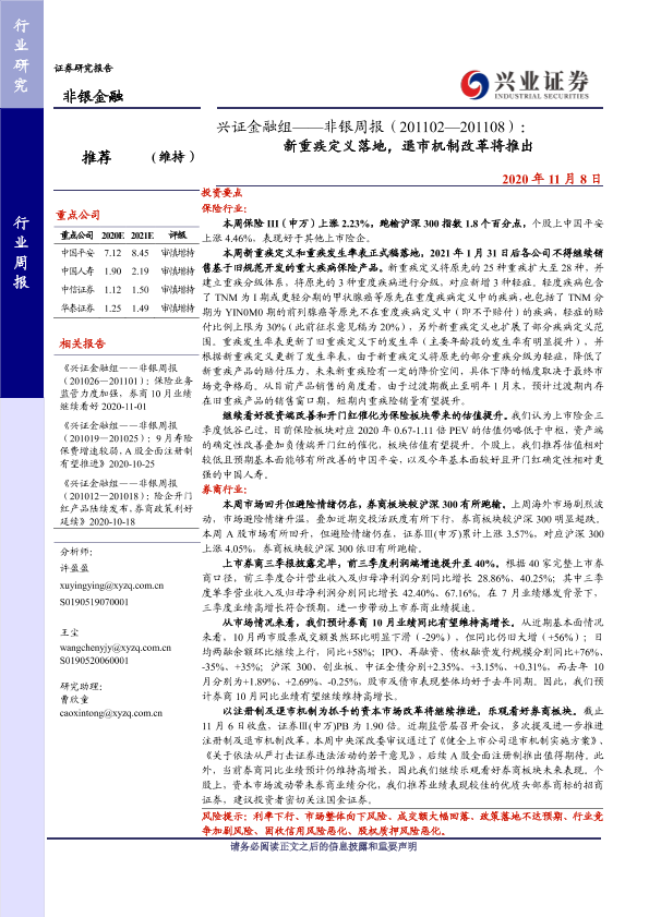 【兴业证券】【20201108】非银周报:新重疾定义落地,退市机制改革将推出-11页